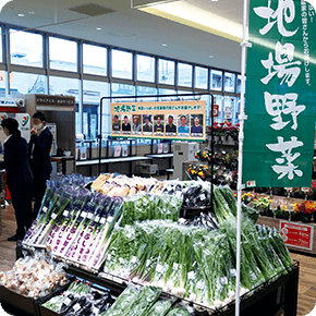 近隣の農家さんから仕入れた野菜を「地場野菜コーナー」で展開。収穫場所から店までの距離が短いため鮮度抜群でCO2排出量も抑えられています。