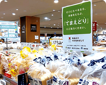 「てまえどり」は、購入時に棚の手前の消費期限や賞味期限が近い商品から選んで頂くことで、食品ロスを減らし、廃棄物削減にも貢献しています。