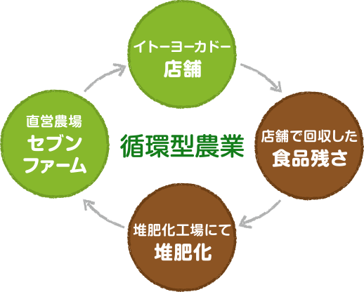 イトーヨーカドーでは、店舗で出た野菜くずなどを使い堆肥を作り、地域の生産者と共に野菜を育てて販売する「循環型農業」に取り組んでいます。