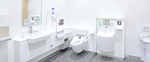 高齢者、障害者、妊娠中やお子様連れのお客さまが快適にご利用いただけるように、便座の位置や洗面台の高さを変えて使いやすくしました。トイレ内に赤ちゃん用のベッドも設置しておりますので、どうぞご利用ください。